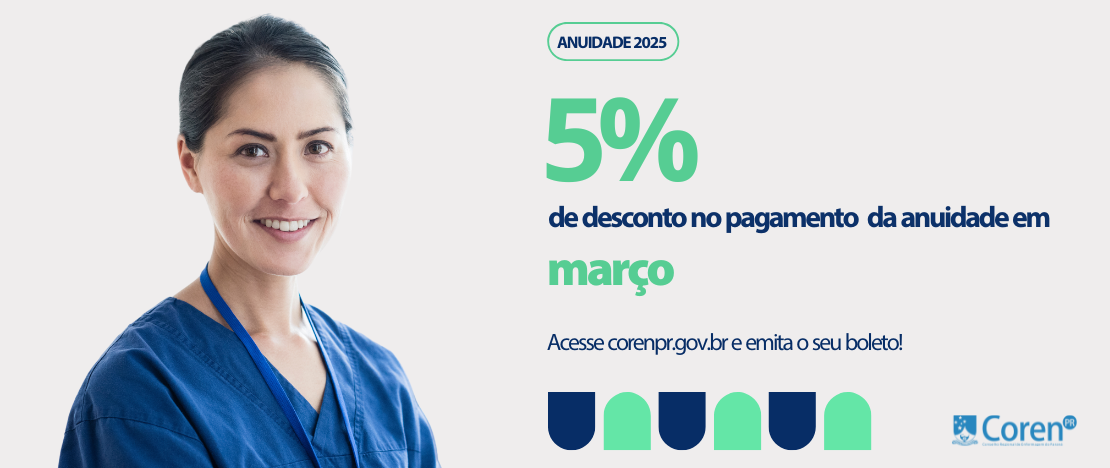 A anuidade 2025 do Conselho Regional de Enfermagem do Paraná (Coren-PR) está com desconto de 5% para pagamento até o dia 31 de março. Emita seu boleto de forma rápida e prática clicando aqui, e garanta a condição especial.