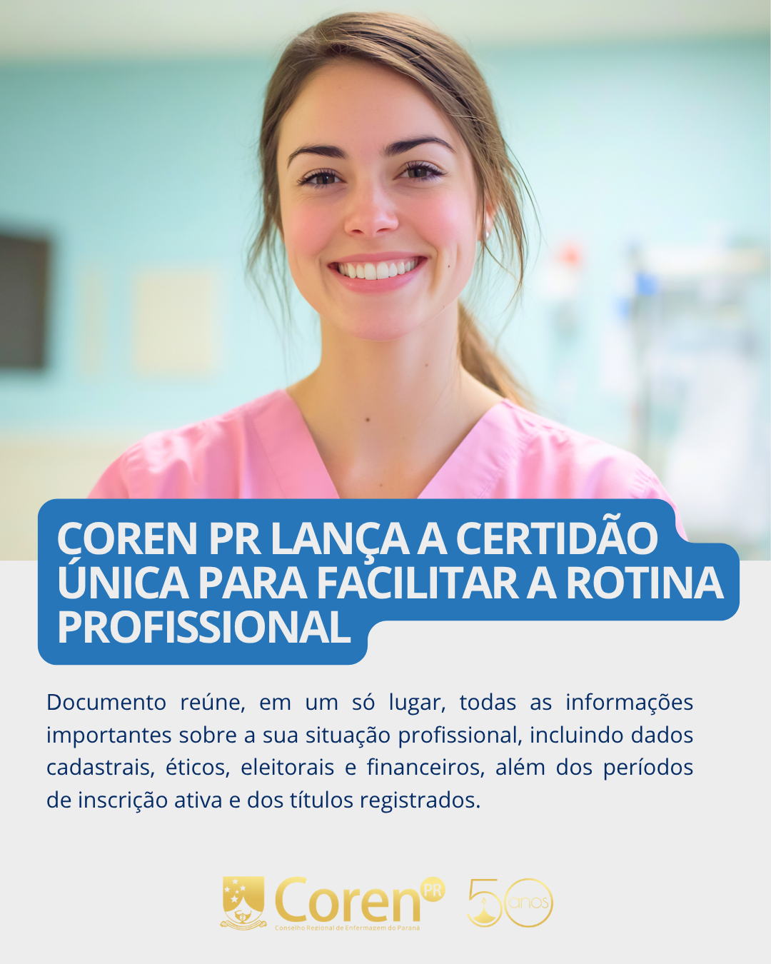 O Conselho Regional de Enfermagem do Paraná (Coren PR) lançou a Certidão Única, um novo documento que reúne, em um só lugar, todas as informações importantes sobre a sua situação profissional, incluindo dados cadastrais, éticos, eleitorais e financeiros, além dos períodos de inscrição ativa e dos títulos registrados.