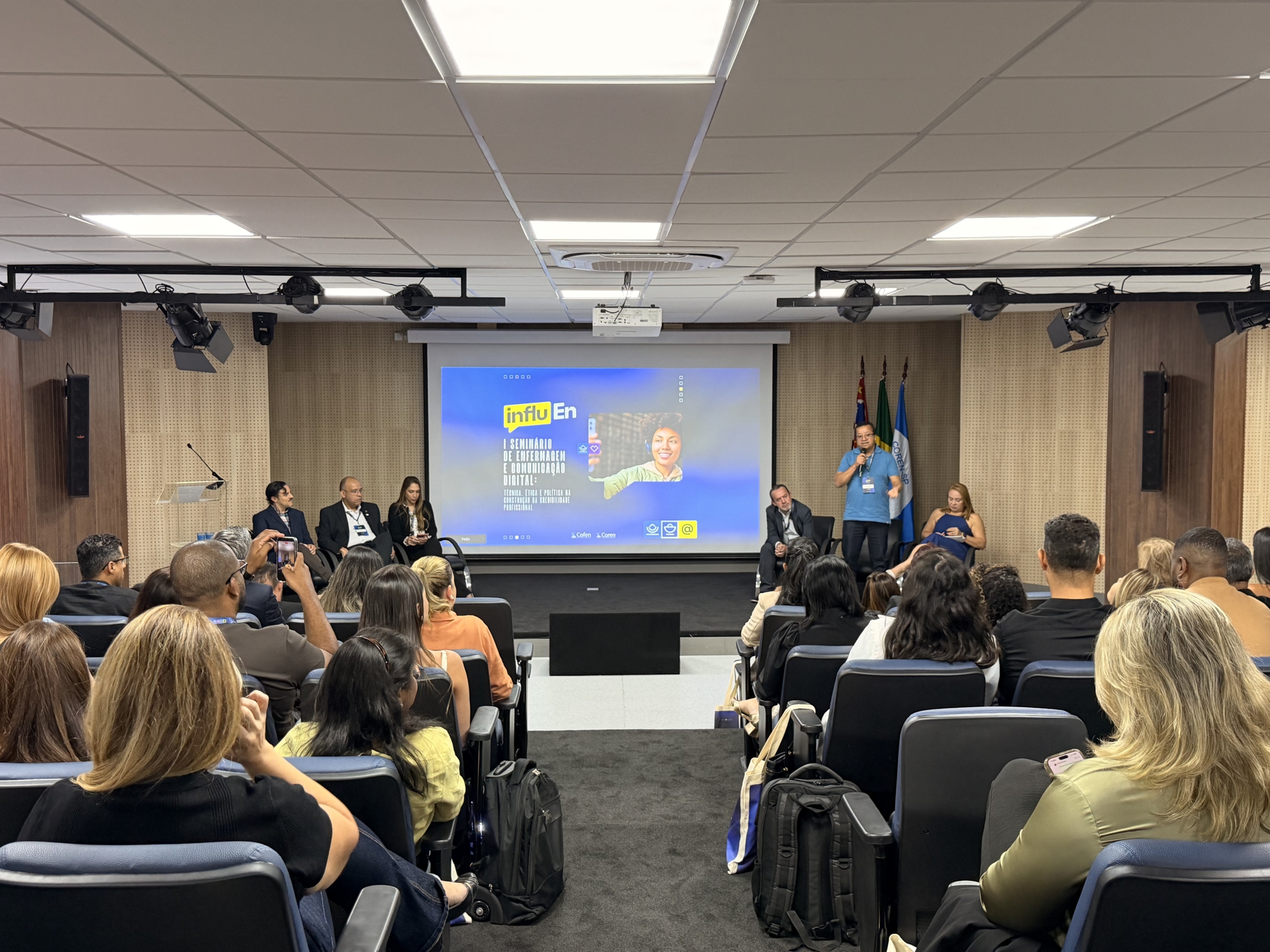 A programação também contou com a participação de representantes do Sistema Cofen/Conselhos Regionais. O primeiro-tesoureiro do Cofen e conselheiro do Coren-SP, James dos Santos, destacou que o avanço das redes sociais exige preparo dos profissionais para lidar com a difusão de informações. “A Enfermagem precisa ocupar esse espaço com responsabilidade, sempre pautada no conhecimento científico e no compromisso com a população”, pontuou.